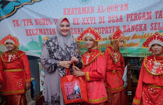 MOTRET.ID — Wakil Bupati Bangka Selatan Debby Vita Dewi, S.E didampingi suami H. Jamro H. Jalil hadiri acara Khataman TKA/TPA Nurul Ihsan Unit 007 Desa Pergam Kecamatan Air Gegas ke XXVI Tahun 2023 di Masjid Nurul Ihsan, Minggu (4/6/23).