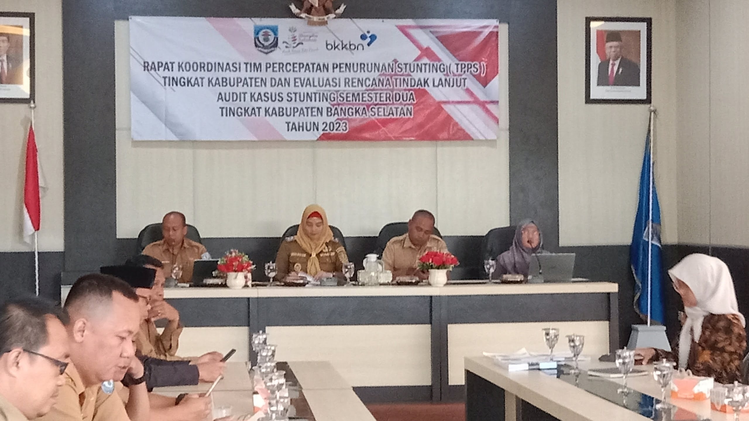 Toboali, motret.id — Pemerintah Kabupaten Bangka Selatan melalui Dinas Kesehatan Kabupaten Bangka Selatan melakukan Rapat koordinasi (Rakor) tim percepatan penurunan Stunting (TPPS) Kabupaten Bangka Selatan dan Evaluasi Rencana Tindak Lanjut Audit Kasus Stunting Semester Dua (2) Tingkat Kabupaten tahun 2023, bertempat di Gedung Pertemuan Gunung Namak Selasa, (5/12/2023).