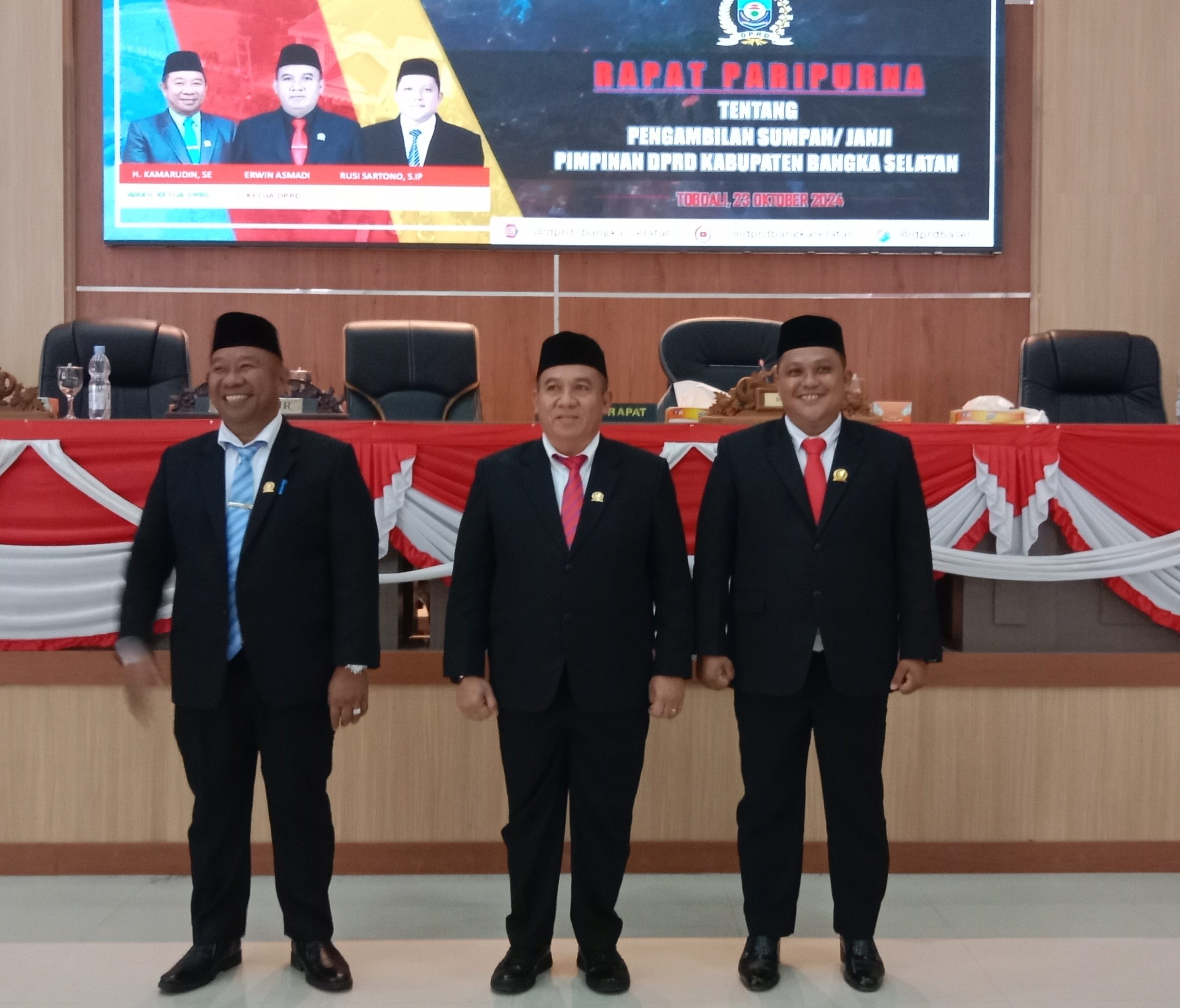 Adapun yang resmi diangkat sebagai Pimpinan DPRD Kabupaten Bangka Selatan periode 2024-2029 dan diambil Sumpah/Janjinya hari ini yakni Ketua Erwinn Asmadi, Wakil Ketua I H. Kamarudin,S.E dan Wakil Ketua II Rusi Sartono, S.IP.
