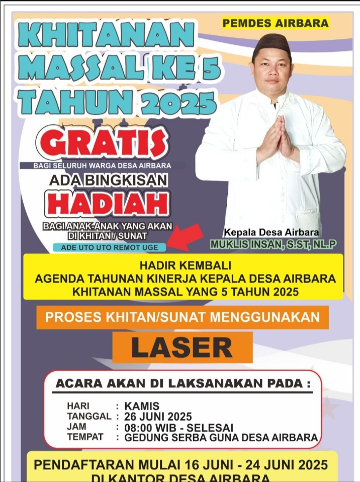 Motret.id, id, AIR BARA – Desa Air Bara, Kecamatan Air Gegas, Kabupaten Bangka Selatan, kembali menggelar kegiatan khitanan massal gratis untuk warga. Agenda tahunan ini memasuki tahun ke-5 pelaksanaannya dan akan dilangsungkan pada Kamis, 26 Juni 2025 mendatang.
