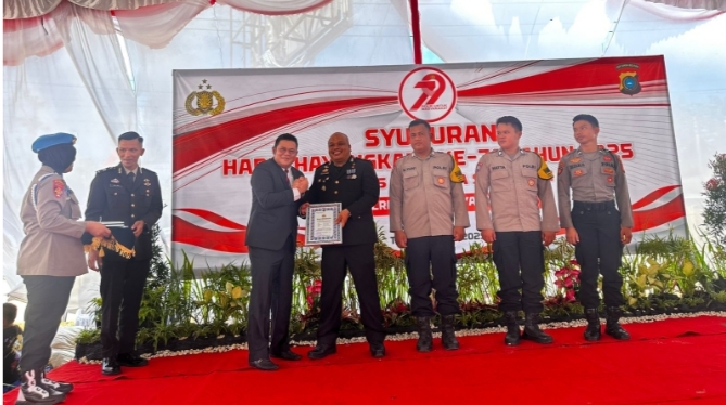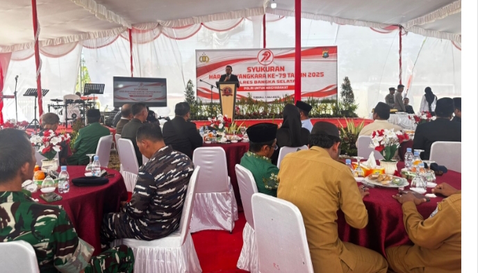 Motret.id, Toboali – Bupati Bangka Selatan Riza Herdavid, bersama Wakil Bupati Debby Vita Dewi, dan unsur Forkopimda menghadiri syukuran Hari Bhayangkara ke-79 sekaligus meresmikan Kantor Polsek Toboali yang baru di Parit 9, Selasa (1/7/2025).